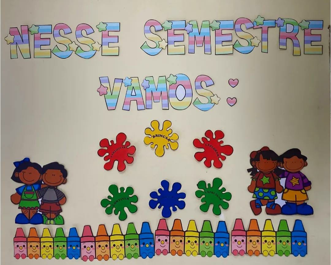 Kit painel volta do semestre convidando para participar dos seis direitos de aprendizagem participar, brincar, conviver, expressar, explorar, e conhecer-se.Arquivos tamanho poster
